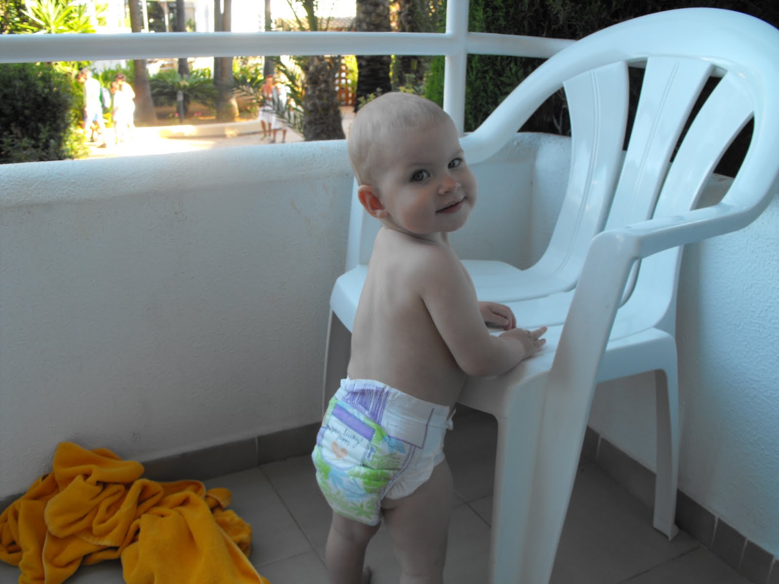 Står och flörtar med grannarna på balkongen bredvid, men tröttnar fort och spexar lite istället.